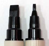 ZIG Calligraphy. Excellent marker with two hard tips: 2 et 5 mm, water based pigmented ink, waterproof when dry (devoid of xylene and smell). Store horizontally. Total length 170 mm, made in Japan